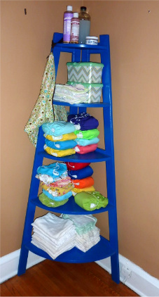 i love the last picture of all thes stuff on a little shelf. i keep all my daughters diapers down stairs in the living room. they are all stacked up in a little container next to the tv. its where we spend most of the day. after she poops i spray the diapers with a diaper sprayer from the dollar store. then they go in a huge wet bag that stays in the hall next to our dirty clothes chair.. lol we just moved and are lacking in the laundry basket department so we just put the dirty clothes on the chair until we have enough to wash.