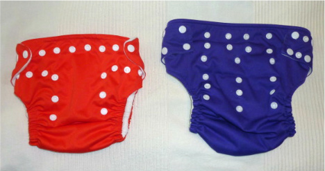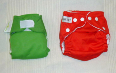 Below shows two identical Sunbaby diapers side by side. One is snapped down as small as it goes. The other is on the largest settings, short of undoing the hip snaps.
