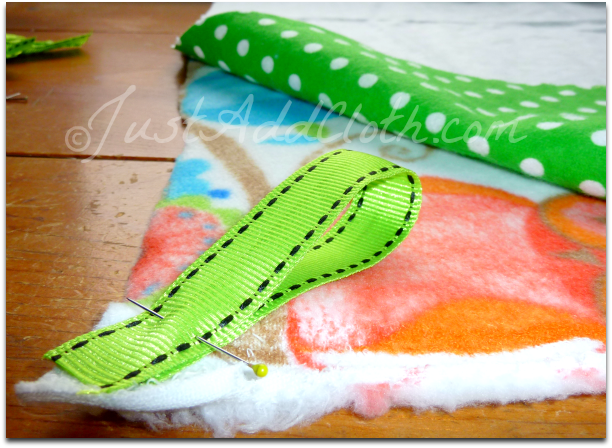• Fold your ribbon piece in half and tuck the loop end on the inside of your inside-out blanket. Secure the tag with a pin on the opposite edge.