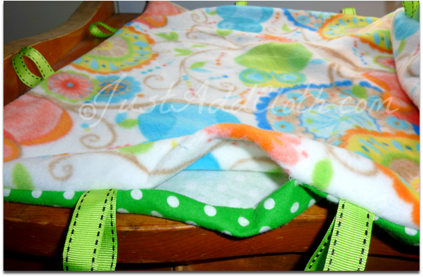 • Repeat with each tag loop around your blanket. You may space the tags at any interval you prefer. I did one on each corner and two between corners.