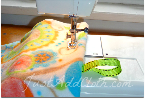 Once your inside-out blanket has all of the tags pinned inside, it is time to whip out the sewing machine, (mine is a Threadbanger) and sew around the perimeter of the blanket. Since I was just working with flannel and fleece for a blanket, I just did a simple straight stitch about 1/3 of an inch from the edge. Make sure to stop a few inches from your start point so that you can flip your blanket right side out