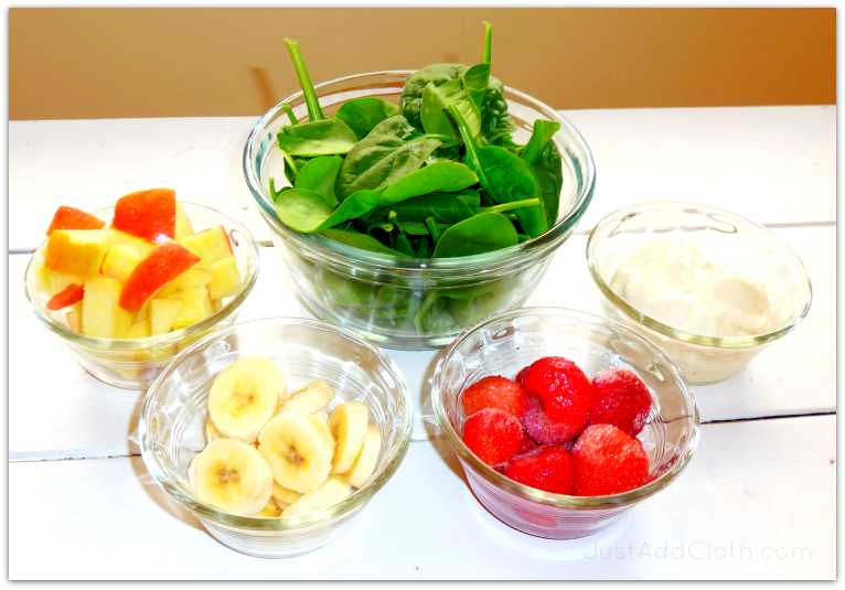 Add your ingredients to a tall cylindrical container with the apple and strawberries on the top layer if using an immersion blender, or in any layer in a quality blender. I use the whip setting for about 60 seconds. The result looks like creamy guacamole, and tastes very fruity and rich.